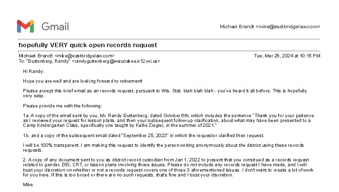 I must respectfully disagree. I filed an open records request on March 26, 2024 with the Waunakee Community School District, as follows: